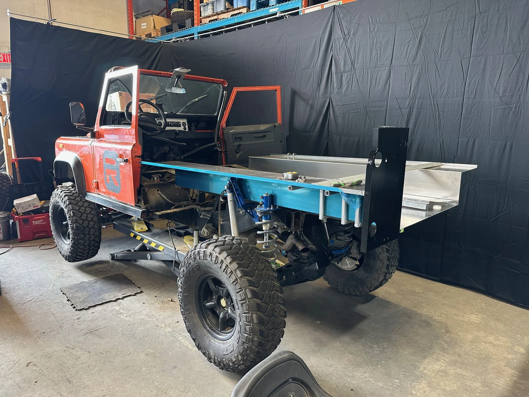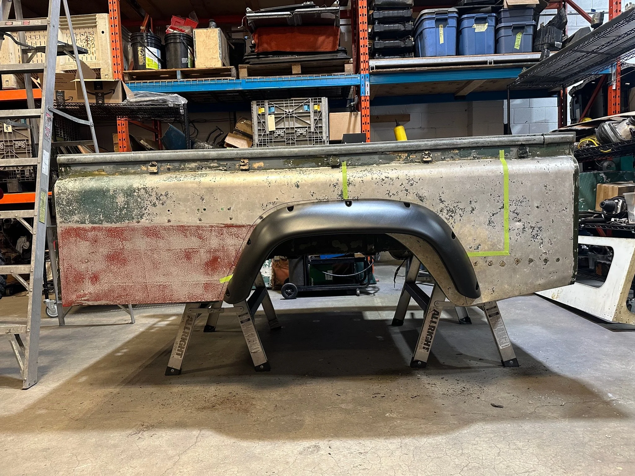 It wasn’t top of mind in the beginning, but eventually I realized we’d need a rear taildoor. I figured I could make one, but I was advised that I already had taken on too much. So, we ordered an OE version of the original Puma Defender taildoor from the UK. We had to trim the bottom to fit the tub, which had less room with the raised rear crossmember.
