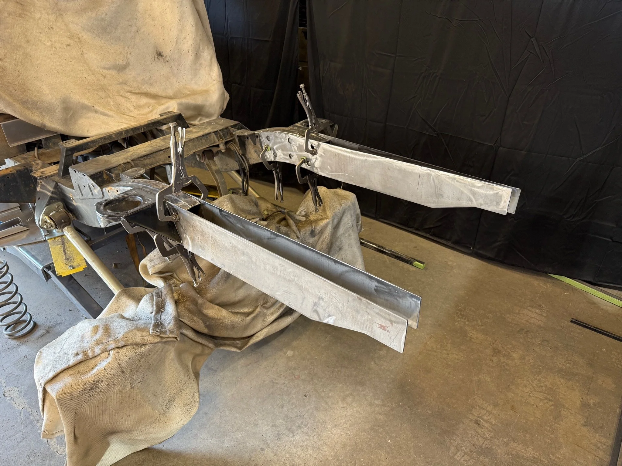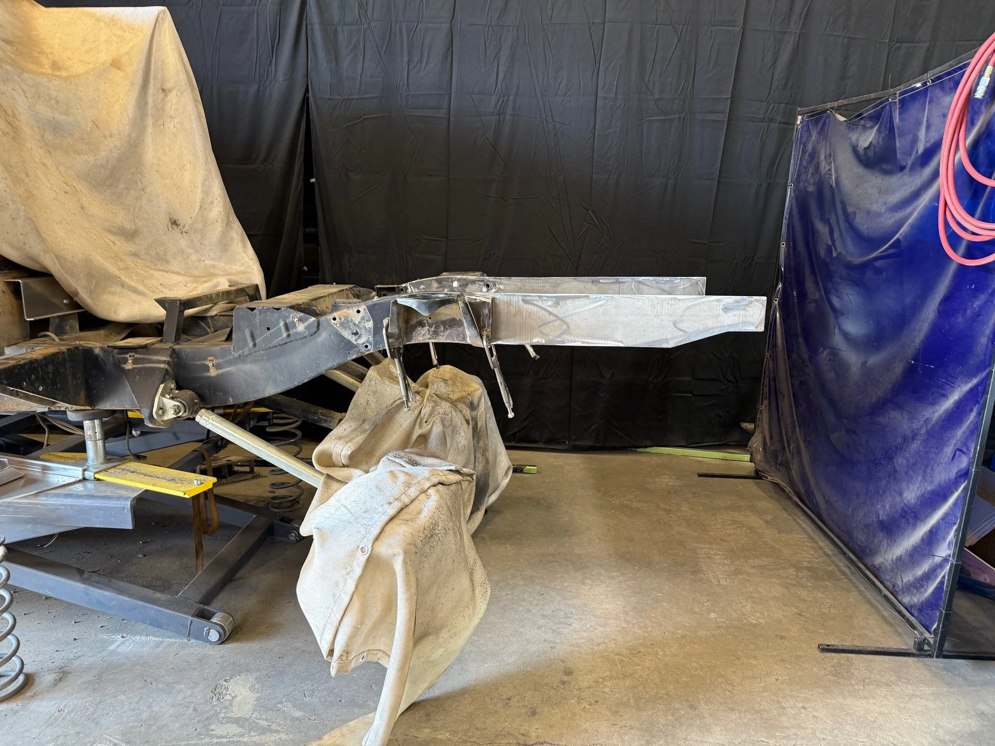 While the tub was exciting to see come together, the chassis was difficult to figure out. We basically had the tub floating in the air and not much of the original chassis to reference off. We spent a lot of time measuring, re-measuring and straightening the front half of the bodywork and bulkhead to make sure everything was properly square and true. In the end we based the chassis off the tub position and the door gaps, which was kind of backwards. This was way more time consuming than I’d planned, but it allowed for a few custom Buggy modifications including the extra 2-½” inches of clearance at the rear crossmember. We used 3/16” steel plate cut on our Arcdroid CNC Plasma cutting table and a 4x4 square tube for the rear crossmember. It’s a bit overkill, but that’s how we roll. We added the jack point tubes and the tapered ends to the rear crossmember to match the style of a factory crossmember.