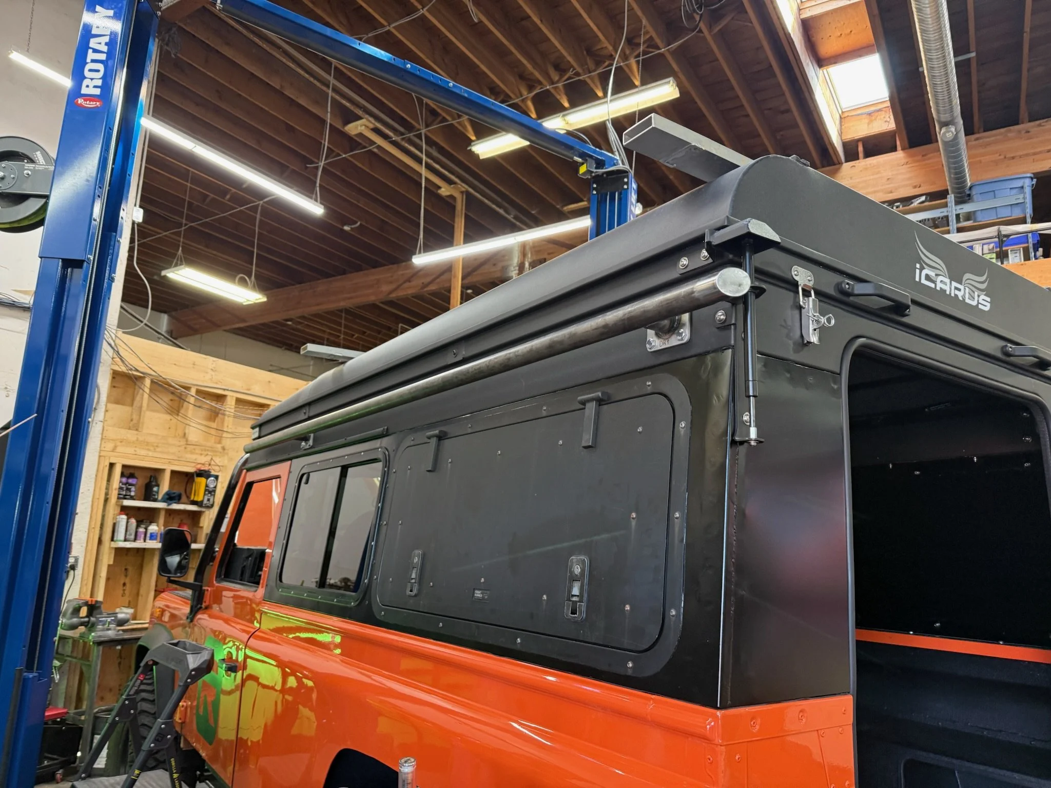 In February, I did a deep dive into the design making a lot of sketches and researching all the options. I have been off-roading and camping in Land Rover’s for over 30 years. I’ve slept in a tent on the ground, had a platform in the back of my Series 2a 88” and numerous roof top tents. Ground tents require a flat piece of ground and hopefully you don’t have water running underneath. The sleeping platform inside the vehicle is a good option but you have to empty out your gear every night so there is room to sleep. Roof top tents are nice but packing up, tucking in all the flaps then putting the cover on in the pouring rain is just annoying every single morning while everyone else is waiting for you! I wanted something that was easier to use and more convenient. The Alucab Icarus Pop-up roof seemed to solve all the issues and is the best, bolt on finished product on the market. The next question was, do I build my own pop up roof or spend the cash on the Alucab. Thankfully, we bought the last Alucab Icarus from Cap-It and it solved a lot of problems and saved a lot of potential design and fabrication time.