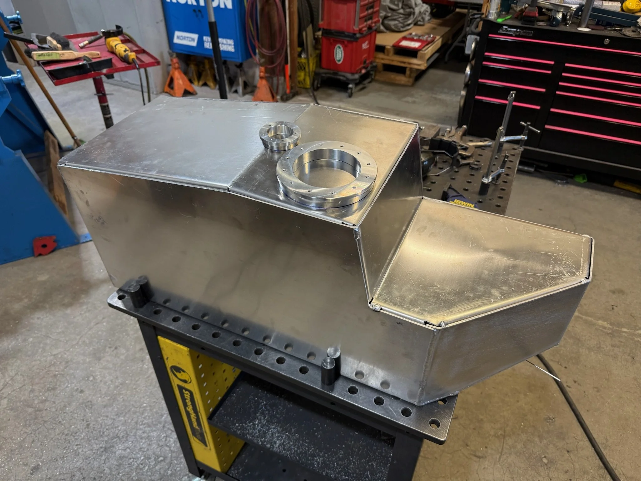 As things were progressing and time was getting on, there was still a big elephant in the room: I didn’t have a fuel tank! The old tank was mounted on top of the chassis where the tub now sat. I planned to end up with two saddle tanks, under the front seats like the older Defenders and Series trucks. My goal was to end up with a range of about 1000km on a fill while maintaining good clearance and off-road capability. With an anticipated 12 liters per 100km fuel economy I would need about 120 liters, which is A LOT!! I decided to build my own custom aluminum fuel tanks with a sloped bottom for off-road clearance but also maximize the space under the seat and front floor boards. I built a wood template for test fitting and then started bending up ⅛” aluminum sheet metal. This turned into another pretty major project within the project. There was a lot of Aluminum TIG welding and, thanks to the tub project, my welding was getting a little better. So I went for it! In the end I had two fuel tanks with a combined volume of 130 to 140 liters. WOW! I did not expect that. They didn’t leak either!
