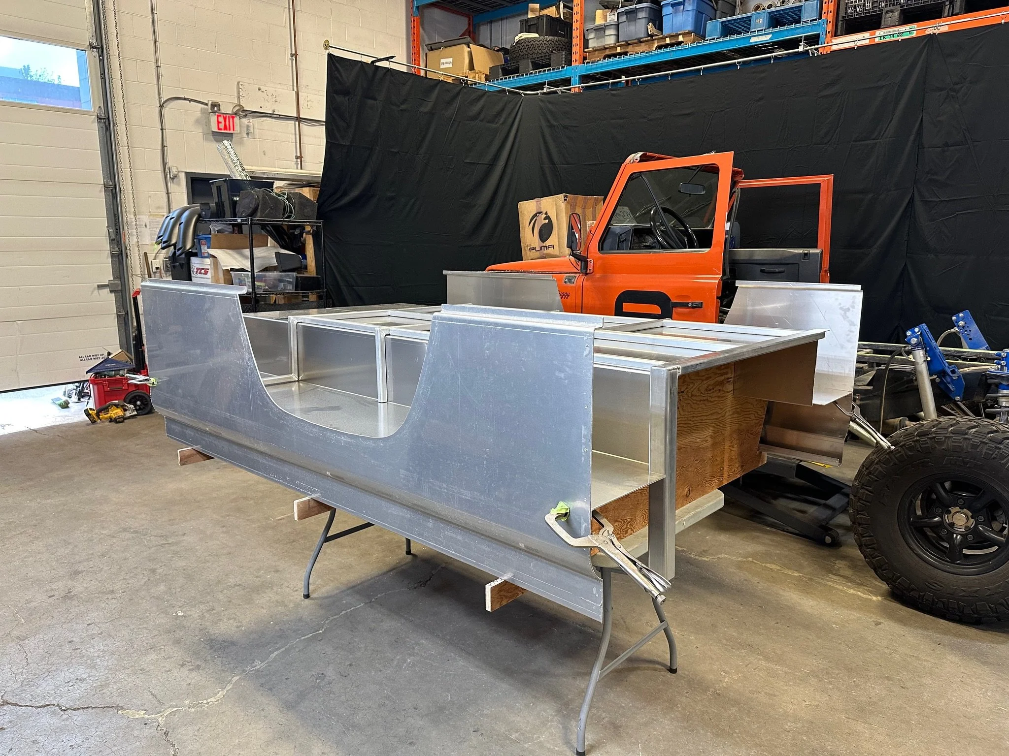 We still needed some 110 or 109” 2-door rear upper side panels. I posted on some forums to try and find a pair of factory panels to work with but never found anything. I decided I would just make my own, seemed simple enough, right! When I got stuck with the tub, I started cutting and prepping the materials for the upper side panels. I decided to go with 0.080” aluminum which is thicker than the factory material but not as heavy as the material we used for the tub. Welding the thinner metal meant there was a lot more heat distortion and warping. This was rather frustrating, but we made it work in the end.